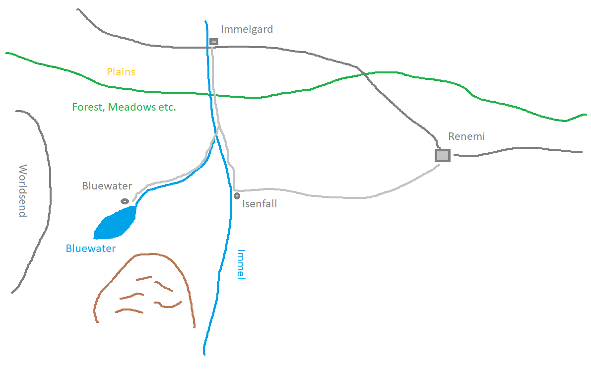 Also, two villages - Isenfall directly on the river, Bluewater at the like-named lake, who’s outflow connects to the Immel. The latter will be the place where Johann Brahm was gainfully employed before things went south, mostly because i need to put that pin somewhere, after all.
