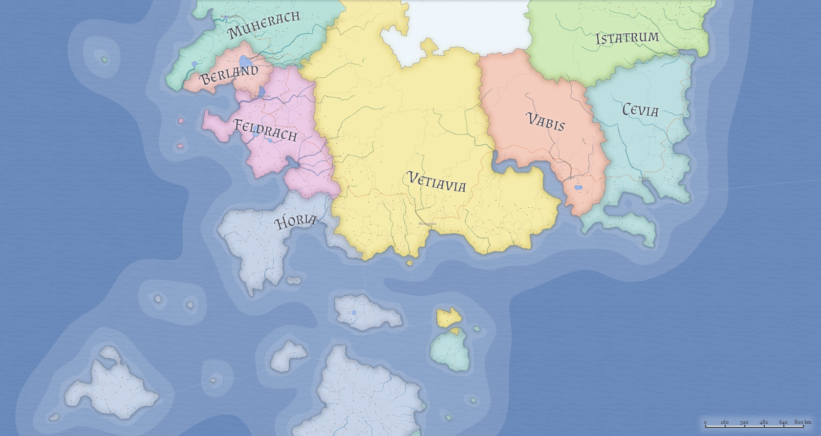 Lastly, I regenerate nations (“states”), provinces, rivers and cities (“burgs”) again to apply the new namespaces, then do it over a few times until it looks right.